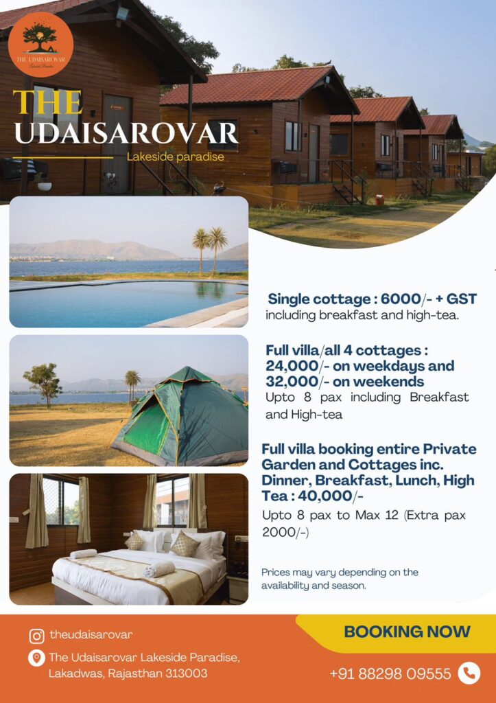 Escape to Serenity at "THE UDAISAROVAR - LAKESIDE PARADISE" Nestled on the shores of a tranquil lake, THE UDAISAROVAR offers a haven of peace and natural beauty. Our lakeside Villa is surrounded by lush greenery and majestic trees, providing a perfect blend of rustic charm and modern comforts. Unwind in our cozy cabins, indulge in water sports, or simply bask in the serene atmosphere. Reconnect with nature and rejuvenate your spirit at "THE UDAISAROVAR"," Best Villa in Udaipur" where the soothing sounds of the lake and the warmth of our hospitality will leave you feeling refreshed and revitalized